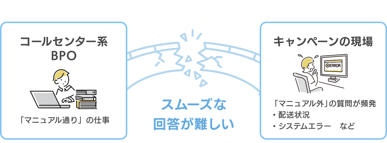 一般的なコールセンター系BPOは定型業務の処理には優れていますが、キャンペーン特有のイレギュラーな問い合わせへのスムーズな回答は難しいといえます。